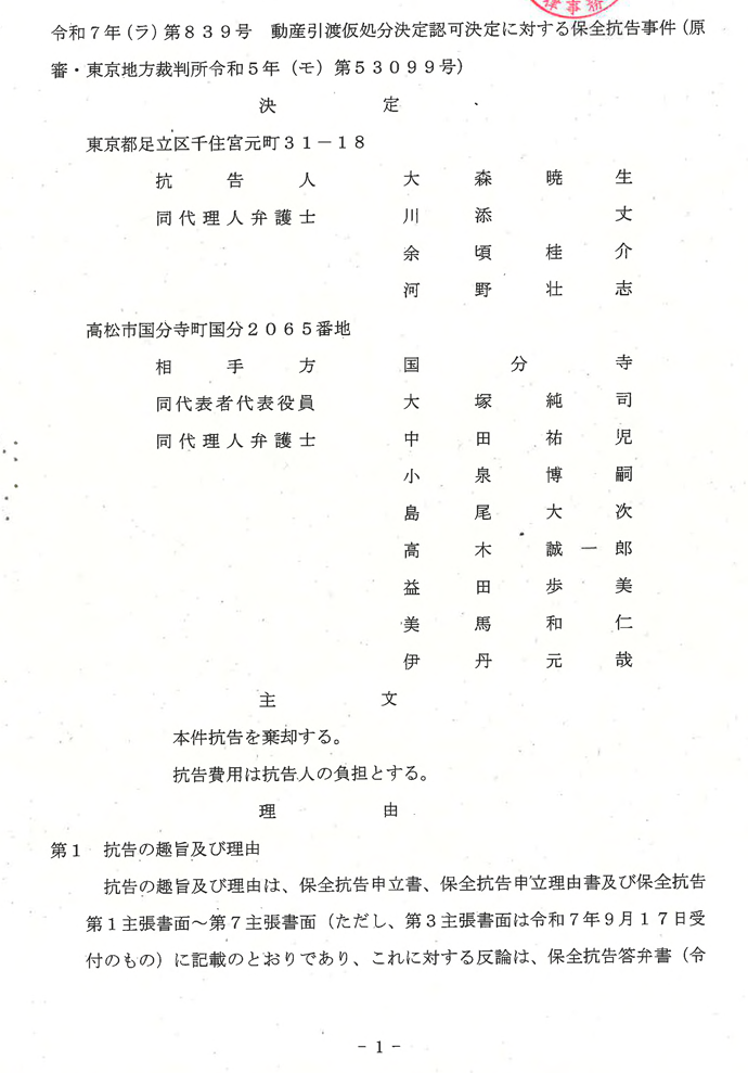 国分寺×大森暁生 抗告決定(東京高裁)